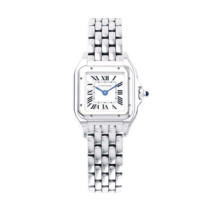 팬더 드 까르띠에 워치, small 모델, 쿼츠 무브먼트. 스틸 케이스, 총 0.24캐럿의 브릴리언트 컷 다이아몬드 36개가 세팅된 베젤, 크기: 23mm x 30mm, 두께: 6mm, 블루 합성 스피넬이 세팅된 크라운, 실버 마감 다이얼, 검 모양의 블루 스틸 핸즈, 스틸 브레이슬릿, 3bar(약 30m) 방수.