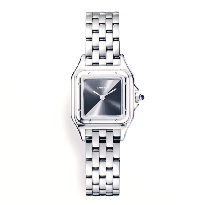 팬더 드 까르띠에 워치, small 모델, 쿼츠 무브먼트. 스틸 케이스, 크기: 22mm x 30mm, 두께: 6mm, 블루 합성 스피넬 1개가 세팅된 크라운, 중앙에 대각선을 형성하는 블랙 및 그레이 그라데이션 다이얼, 검 모양의 핸즈, 스틸 스트랩, 3bar(약 30m) 방수.