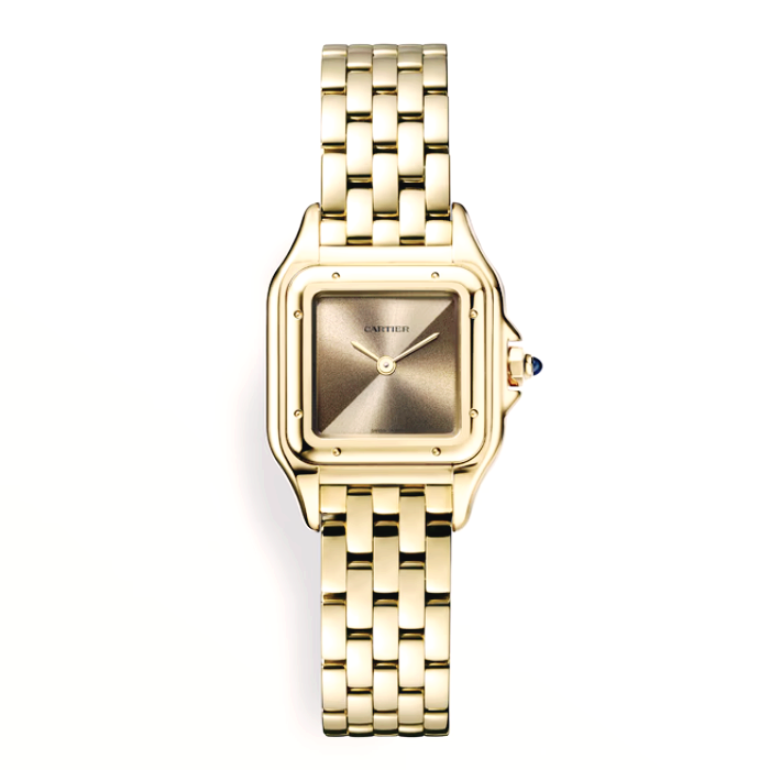 팬더 드 까르띠에 워치, small 모델, 쿼츠 무브먼트. 750/1000 옐로우 골드 케이스, 크기: 22mm x 30mm, 두께: 6mm, 블루 사파이어 1개가 세팅된 크라운, 중앙에 대각선을 형성하는 골드 및 골드 브라운 그라데이션 다이얼, 검 모양의 핸즈, 750/1000 옐로우 골드 스트랩, 3bar(약 30m) 방수.