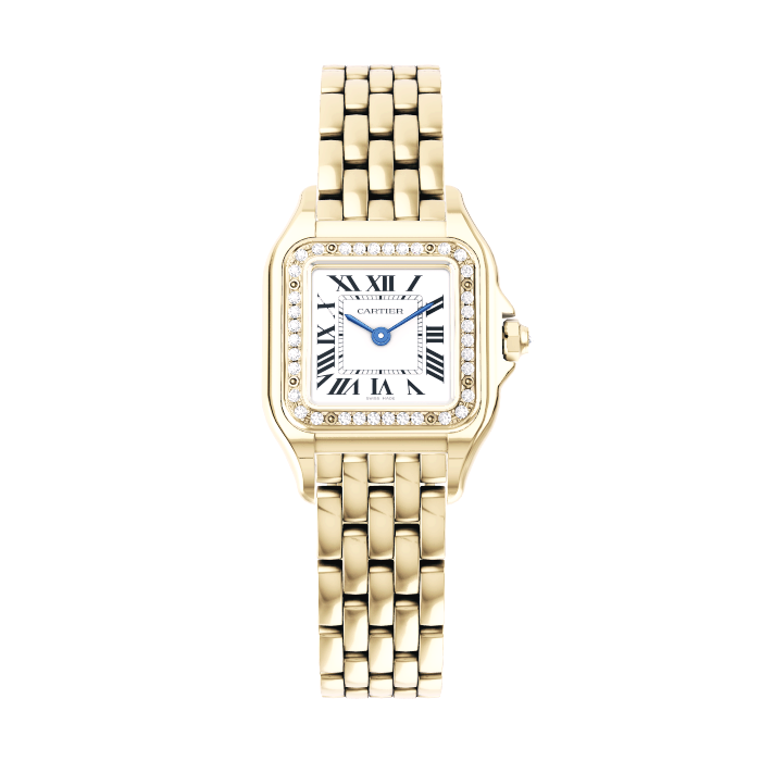 팬더 드 까르띠에 워치, small 모델, 쿼츠 무브먼트. 총 0.27캐럿의 브릴리언트 컷 다이아몬드 37개가 세팅된 750/1000 옐로우 골드 케이스와 크라운. 크기: 22mm x 30mm, 두께: 6mm, 실버 마감 다이얼, 검 모양의 블루 스틸 핸즈, 750/1000 옐로우 골드 브레이슬릿, 3bar(약 30m) 방수.