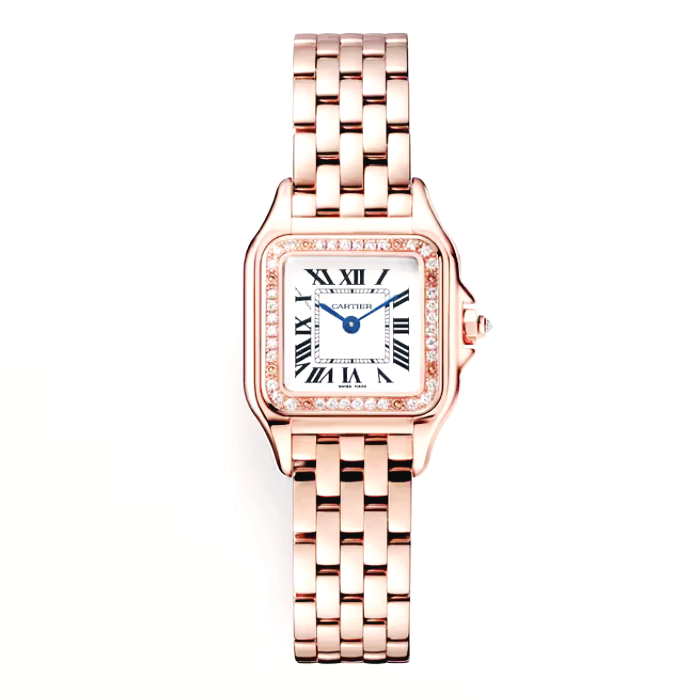 팬더 드 까르띠에 워치, small 모델, 쿼츠 무브먼트. 총 0.27캐럿의 브릴리언트 컷 다이아몬드 37개가 세팅된 750/1000 핑크 골드 케이스와 크라운. 크기: 22mm x 30mm, 두께: 6mm, 다이아몬드가 세팅된 크라운, 실버 마감 다이얼, 검 모양의 블루 스틸 핸즈, 750/1000 핑크 골드 브레이슬릿, 3bar(약 30m) 방수.