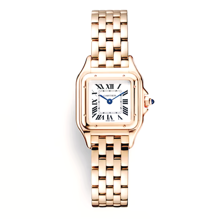 팬더 드 까르띠에 워치, small 모델, 쿼츠 무브먼트. 750/1000 핑크 골드 케이스, 크기: 23mm x 30mm, 두께: 6mm, 블루 사파이어가 세팅된 크라운, 실버 마감 다이얼, 검 모양의 블루 스틸 핸즈, 750/1000 핑크 골드 브레이슬릿, 3bar(약 30m) 방수.