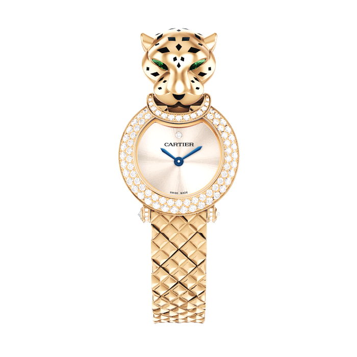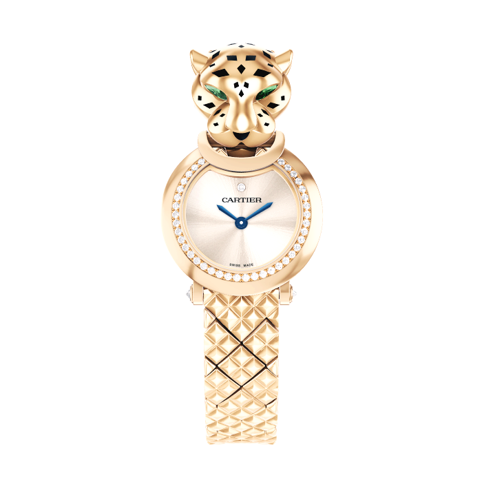 라 팬더 워치, 23.6mm, 쿼츠 무브먼트. 총 0.24캐럿의 브릴리언트 컷 다이아몬드 40개가 세팅된 750/1000 옐로우 골드 케이스, 750/1000 옐로우 골드 팬더 헤드, 페어형 차보라이트 눈, 블랙 래커 코와 스팟, 골드 다이얼, 골드 피니싱 검 모양의 블루 스틸 핸즈, 그레이 세미-매트 앨리게이터 가죽 스트랩, 750/1000 옐로우 골드 아르디옹 버클. 두께: 7.8mm. 3bar(약 30m) 방수.