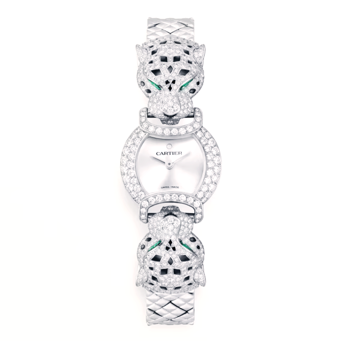 팬더 워치, 23.6mm, 쿼츠 무브먼트. 총 1.04캐럿의 브릴리언트 컷 다이아몬드 136개가 세팅된 로듐 도금 750/1000 화이트 골드 케이스, 총 1.43캐럿의 브릴리언트 컷 다이아몬드 297개가 세팅된 로듐 도금 750/1000 화이트 골드 팬더 헤드, 총 0.15캐럿의 페어형 에메랄드 눈, 블랙 래커 반점과 코, 총 0.54캐럿의 다이아몬드 117개가 세팅된 로듐 도금 750/1000 화이트 골드 다이얼, 검 모양의 로듐 도금 스틸 핸즈, 로듐 도금 750/1000 화이트 골드 브레이슬릿, 총 17.81캐럿의 브릴리언트 컷 다이아몬드 464개와 피라미드형 블랙 스피넬 52개 세팅. 총 0.36캐럿의 브릴리언트 컷 다이아몬드 22개가 세팅된 로듐 도금 750/1000 화이트 골드 아르디옹 버클. 두께: 7.8mm. 3bar(약 30m) 방수.