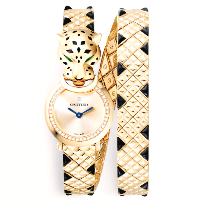 팬더 워치, 23.6mm, 쿼츠 무브먼트. 총 0.24캐럿의 브릴리언트 컷 다이아몬드 40개가 세팅된 750/1000 옐로우 골드 케이스, 750/1000 옐로우 골드 팬더 헤드, 총 0.16캐럿의 페어형 차보라이트 눈, 블랙 래커 반점과 코, 골드톤 다이얼, 검 모양의 블루 스틸 핸즈, 52개의 피라미드형 블랙 스피넬이 세팅된 옐로우 골드 브레이슬릿, 750/1000 옐로우 골드 아르디옹 버클. 두께: 7.8mm. 3bar(약 30m) 방수.