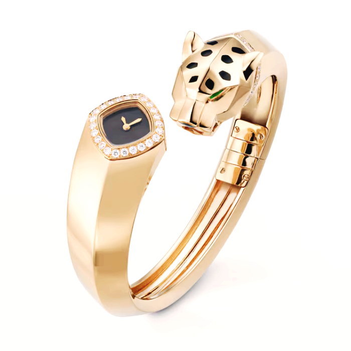 팬더 드 까르띠에 뱅글 워치, 18mm, 쿼츠 무브먼트. 750/1000 옐로우 골드 케이스, 총 0.42캐럿의 브릴리언트 컷 다이아몬드 24개가 세팅된 베젤, 750/1000 옐로우 골드 팬더 헤드, 페어형 차보라이트 눈, 블랙 래커 스팟, 총 0.23캐럿의 브릴리언트 컷 다이아몬드 20개가 세팅된 칼라, 블랙 래커 다이얼, 검 모양의 골드 피니싱 스틸 핸즈, 750/1000 옐로우 골드 브레이슬릿. 두께: 8.5mm. 3bar(약 30m) 방수. 사이즈 16.