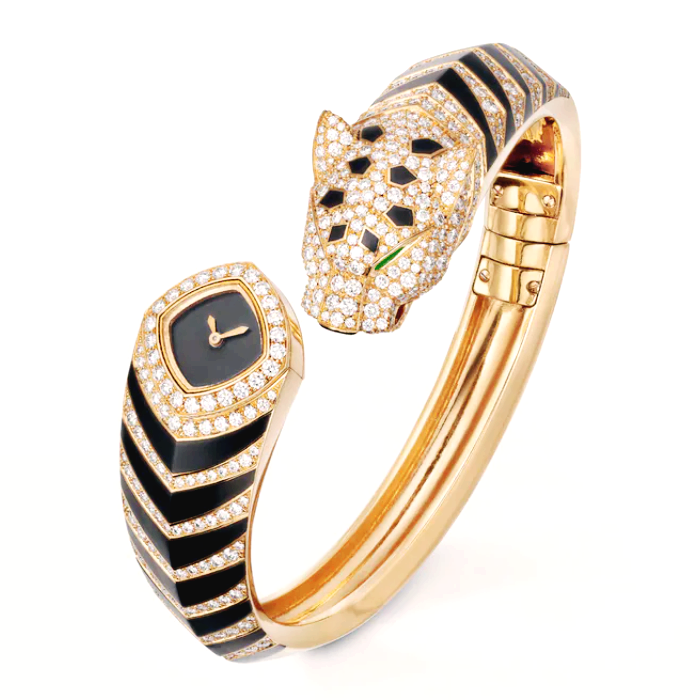 팬더 드 까르띠에 뱅글 워치, 18mm, 쿼츠 무브먼트. 750/1000 옐로우 골드 케이스, 총 0.42캐럿의 브릴리언트 컷 다이아몬드 24개가 세팅된 베젤, 총 4.29캐럿의 브릴리언트 컷 다이아몬드 488개가 세팅된 750/1000 옐로우 골드 브레이슬릿과 팬더 헤드, 페어형 에메랄드 눈, 블랙 래커 모티프, 블랙 래커 다이얼, 검 모양의 골드 피니싱 스틸 핸즈. 두께: 8.5mm. 3bar(약 30m) 방수. 사이즈 18.