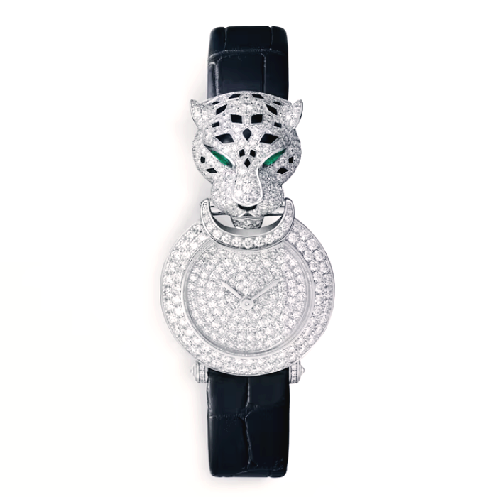 라 팬더 워치, 23.6mm, 쿼츠 무브먼트. 총 1.04캐럿의 브릴리언트 컷 다이아몬드 136개가 세팅된 로듐 도금 750/1000 화이트 골드 케이스, 총 1.43캐럿의 브릴리언트 컷 다이아몬드 297개가 세팅된 로듐 도금 750/1000 화이트 골드 팬더 헤드, 총 0.15캐럿의 페어형 에메랄드 눈, 블랙 래커 스팟 및 코, 총 0.54캐럿의 다이아몬드 117개가 세팅된 로듐 도금 750/1000 화이트 골드 다이얼, 검 모양의 로듐 도금 스틸 핸즈, 블랙 세미-매트 앨리게이터 가죽 스트랩, 총 0.23캐럿의 브릴리언트 컷 다이아몬드 24개가 세팅된 로듐 도금 750/1000 화이트 골드 버클. 두께: 7.8mm. 3bar(약 30m) 방수.