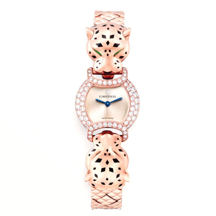 라 팬더 워치, 23.6mm, 쿼츠 무브먼트. 총 0.98캐럿의 브릴리언트 컷 다이아몬드 134개가 세팅된 750/1000 핑크 골드 케이스, 총 1.43캐럿의 브릴리언트 컷 다이아몬드 298개가 세팅된 750/1000 핑크 골드 팬더 헤드, 페어형 에메랄드 눈, 블랙 래커 코 및 스팟, 로제 다이얼, 검 모양의 로듐 도금 스틸 핸즈, 사파이어 글래스, 750/1000 핑크 골드 브레이슬릿. 두께: 7.78mm. 3bar(약 30m) 방수.