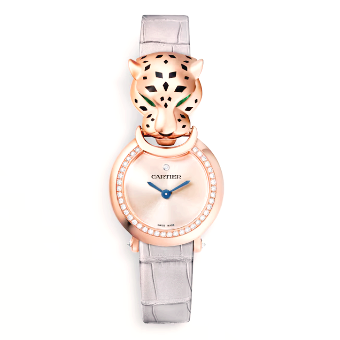 팬더 워치, 23.6mm, 쿼츠 무브먼트. 총 0.24캐럿의 브릴리언트 컷 다이아몬드 40개가 세팅된 750/1000 핑크 골드 케이스, 750/1000 핑크 골드 팬더 헤드, 총 0.16캐럿의 페어형 차보라이트 눈, 블랙 래커 반점과 코, 핑크 다이얼, 검 모양의 블루 스틸 핸즈, 라이트 그레이 세미-매트 앨리게이터 가죽 스트랩, 750/1000 핑크 골드 아르디옹 버클. 두께: 7.7mm. 3bar(약 30m) 방수.