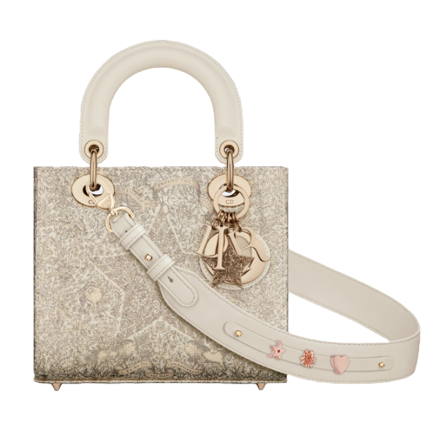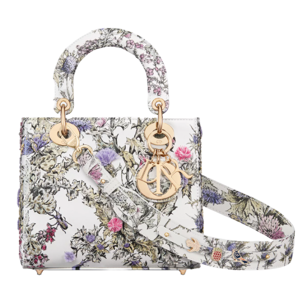 사랑과 로맨스에 대한 Dior의 비전을 담은 Dioramour 캡슐 컬렉션에서 우아함과 아름다움에 대한 디올 하우스의 비전을 완벽하게 담아 선보이는 Lady Dior My ABCDior 백입니다. 타임리스 스타일의 매끈하고 세련된 백으로, 라떼 컬러 송아지 가죽으로 제작되었습니다. 피에트로 루포의 멀티 컬러 Cœur des Curiosités 프린트로 표현된 플라워 디자인에 꿀벌, 나비, 제비 등의 상징이 더해졌습니다. 페일 골드 피니시 메탈 소재의 D.I.O.R. 블록 참은 작은 레진 진주로 장식된 섬세한 모양의 하트 참으로 장식되었습니다. 숄더 스트랩에 배지 장식을 더해 개성을 표현할 수 있는 유니크한 스몰 백으로 핸드백이나 크로스백으로 연출할 수 있습니다.