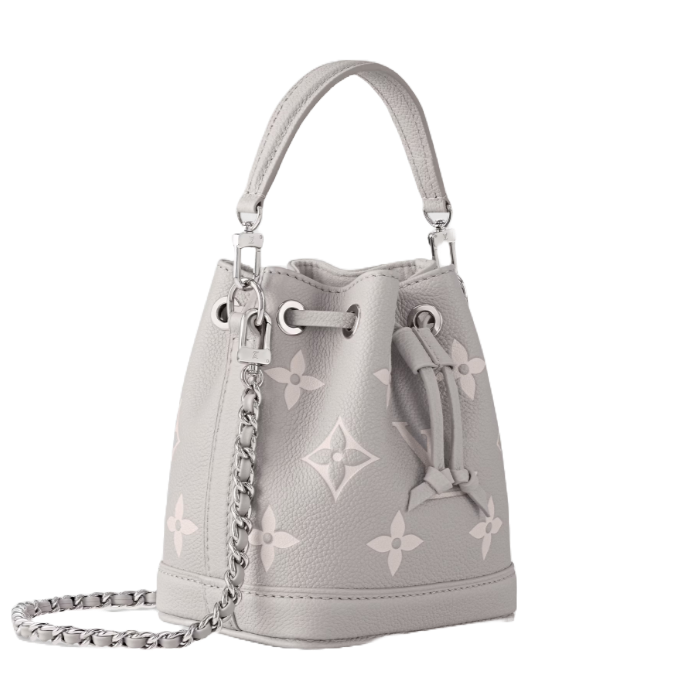 모노그램 패턴을 양각으로 새긴 부드러운 모노그램 앙프렝뜨 가죽 소재로 선보이는 바이컬러 버전의 나노 노에(Nano Noé). 아이코닉한 노에 백을 나노 크기로 재현한 아이템. 일상 필수품을 수납할 수 있는 스타일리시한 디자인. 실용적인 드로스트링 잠금장치. 다양하게 연출할 수 있는 탈착형 핸들, 탈착 및 조절 가능한 숄더 스트랩이 특징.