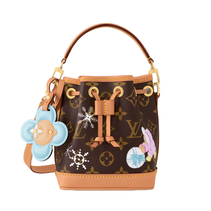 연말 시즌을 기념하며 아이코닉한 비비엔 마스코트의 귀환을 환영하는 나노 노에 스노우 쇼 에디션. 하우스 고유의 모노그램 캔버스 소재. LV 스노우플레이크를 가지고 노는 사랑스러운 캐릭터를 그린 일러스트로 유쾌하고 마법같은 분위기를 자아내는 디자인. 탈착 가능한 비비엔 모양의 가죽 참.