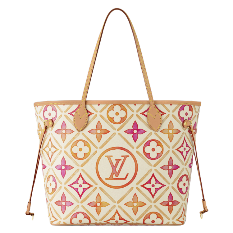 상단과 핸들에 가죽 소재 트리밍을 더해 선보이는 모노그램 타일 캔버스 소재의 네버풀 MM 토트. 수채화 감성을 담아낸 모노그램 패턴과 중앙의 LV 서클이 특징. 분리하여 단독으로 사용할 수 있는 지퍼형 파우치에 조화를 이루는 프린트를 입힌 아이템.
