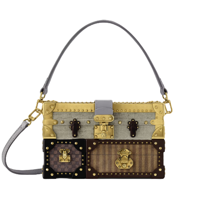 아이코닉한 쁘띠뜨 말의 10주년을 기념하여 하우스의 노하우에 찬사를 바치는 쁘띠뜨 말 셀레브레이션 트리오 이콘 캔버스(Petite Malle Celebration Trio Icône Canvas) 리미티드 에디션. 다미에, 스트라이프, 그리 트라이아논을 포함한 세 가지의 시그니처 캔버스 소재에서 영감을 받은 디자인. 수집가를 위한 아이템. 유서 깊은 루이 비통 러기지를 연상시키는 수작업으로 부착한 작은 나사와 트렁크에서 영감을 받은 모서리가 특징. 시프스킨 소재의 안감 및 각인을 더한 골드 색조의 명판을 구성한 내부.