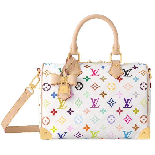루이 비통 x 무라카미 컬렉션에서 일본 예술가 무라카미를 대표하는 팝 색상으로 경쾌하게 재해석한 상징적인 모노그램 모티프를 더해 생기 넘치는 버전으로 선보이는 스피디 반둘리에 25 핸드백. 천연 카우하이드 가죽 소재로 제작한 두 개의 토론 상단 핸들, 탈착 및 조절 가능한 스트랩, 보타이 형태의 유쾌한 LV x TM 키벨이 특징인 클래식한 디자인. 하우스의 상징적인 여행용 트렁크에 오마주를 바치는 골드 색상의 패드락 및 모서리 디테일.