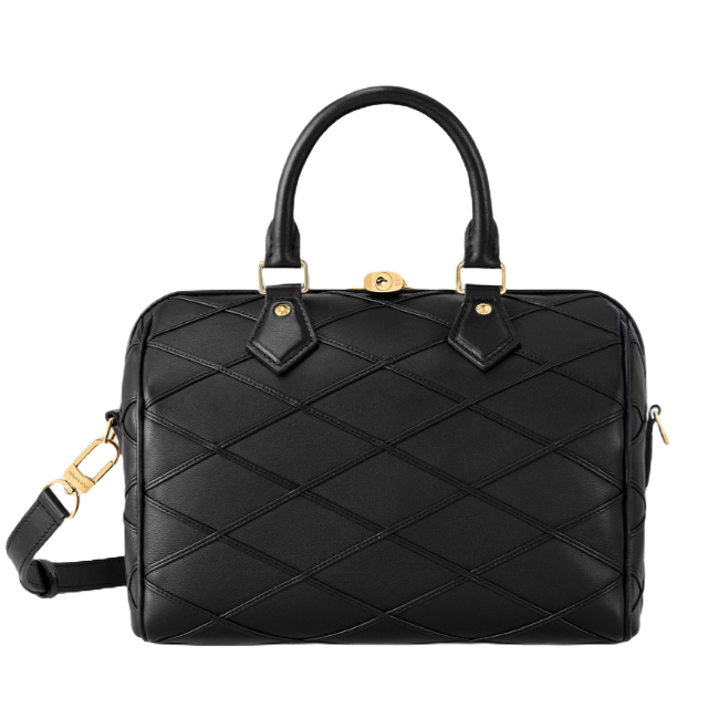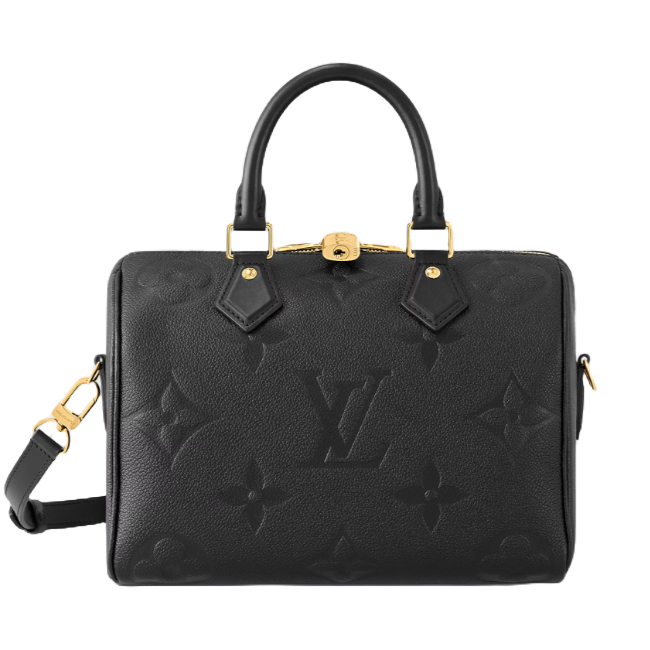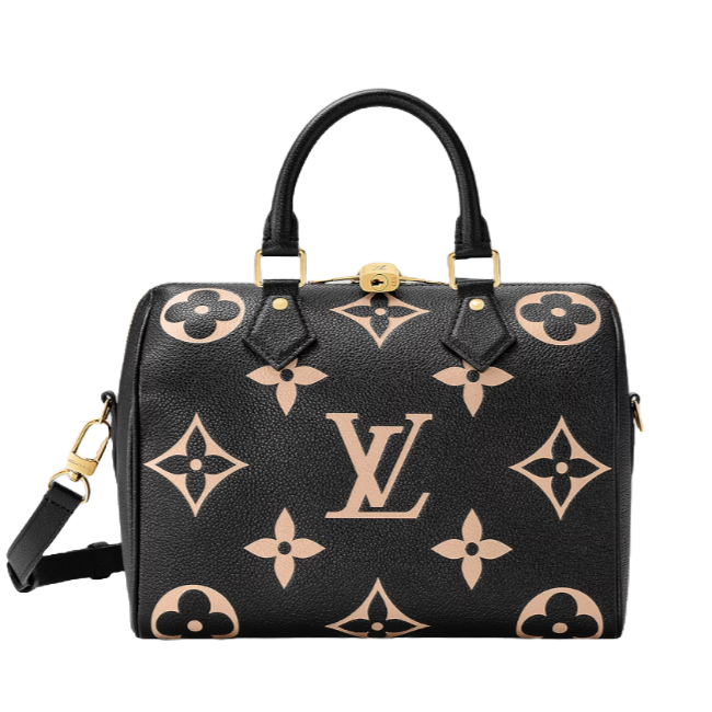 블랙 색상 모노그램 앙프렝뜨 가죽 소재로 선보이는 컴팩트한 스피디 반둘리에 25(Speedy Bandoulière 25). 양각 처리한 베이지 색조의 오버사이즈 모노그램 패턴. 1930년에 소개된 하우스의 '익스프레스' 백에서 영감을 받은 세련된 핸드백. 골드 색감 하드웨어 디테일 및 레드 색상의 내부 안감. 상단 핸들뿐만 아니라 조절 가능한 탈착형 숄더 스트랩을 활용해 다양하게 연출할 수 있는 스타일.
