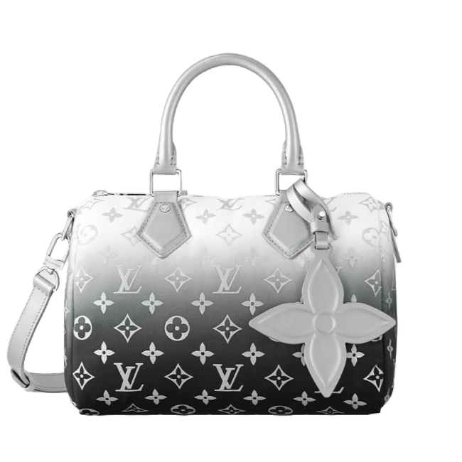 LV 스노우 컬렉션에서 그라디언트 실버 색조의 새로운 모노그램 나일론 소재로 선보이는 스피디 반둘리에 25(Speedy Bandoulière 25). 실버 색상의 하드웨어와 시그니처 플라워 참이 돋보이는 컴팩트한 스타일. 스마트폰, 월릿, 열쇠와 같은 기본 소지품을 보관할 수 있는 크기. 조절 가능한 탈착형 스트랩을 활용하여 다양하게 연출할 수 있는 아이템.