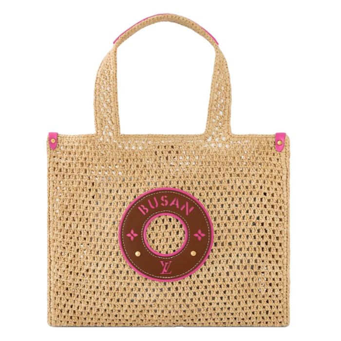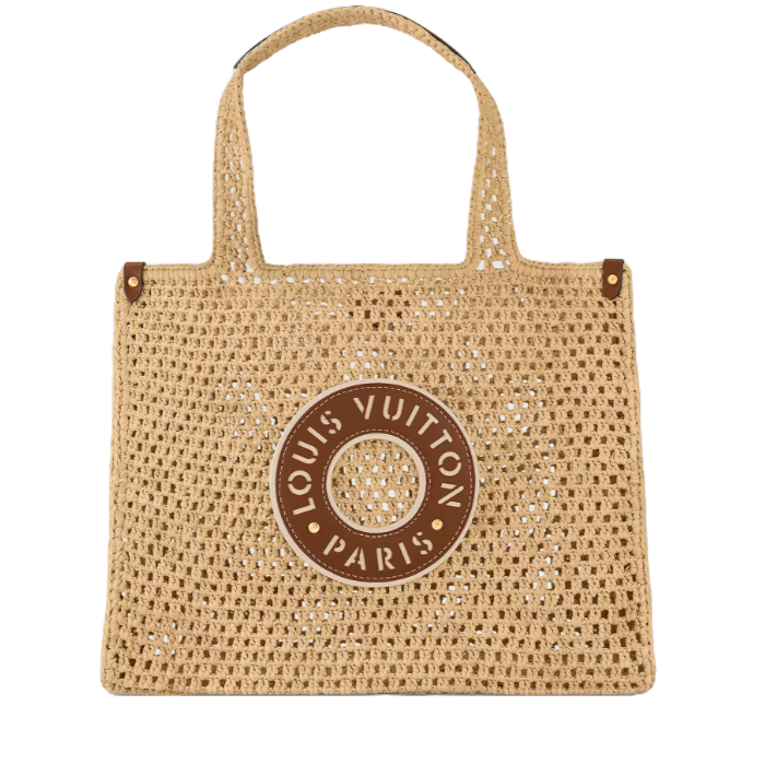 LV 바이 더 풀 컬렉션에서 수작업으로 완성한 100% 천연 라피아 크로셰 소재로 선보이는 온더고 MM 토트. 카우하이드 가죽 소재로 감싸 고정한 모서리. 동일한 소재로 구현한 앞면의 원형 '루이 비통 파리' 패치. 13인치 노트북, 비치 타월 및 다양한 필수품을 수납할 수 있는 아이템.