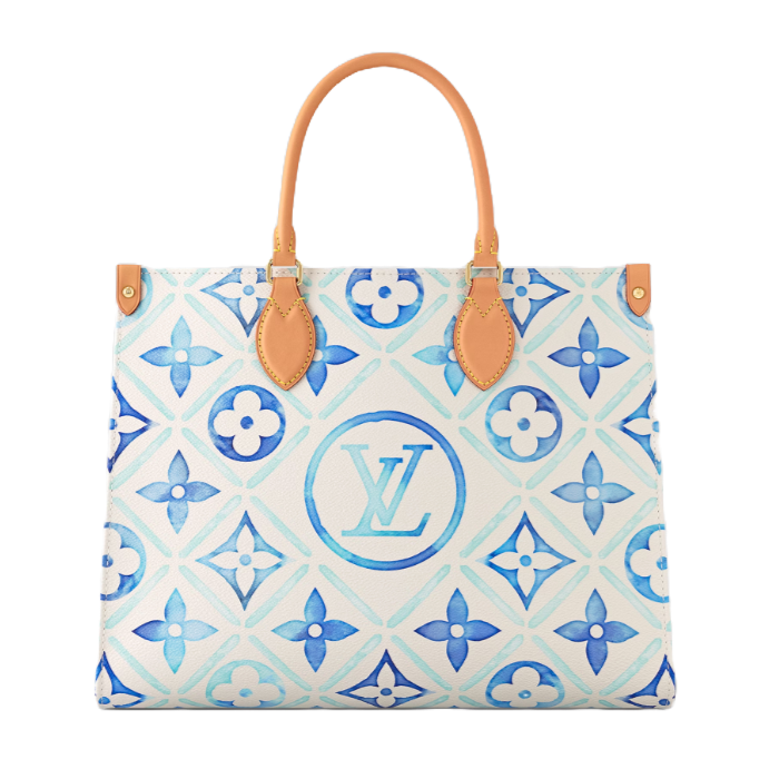 모노그램 타일 캔버스 소재의 온더고 MM 토트. 수채화 감성의 모노그램 프린트와 중앙의 LV 서클이 특징. 카우하이드 가죽 소재로 완성한 두 개의 상단 핸들 및 숨겨진 숄더 스트랩. 같은 소재로 구성한 네 개의 고정된 모서리 탭. 노트북을 포함한 필수 소지품을 충분히 휴대할 수 있는 넉넉한 크기의 아이템.