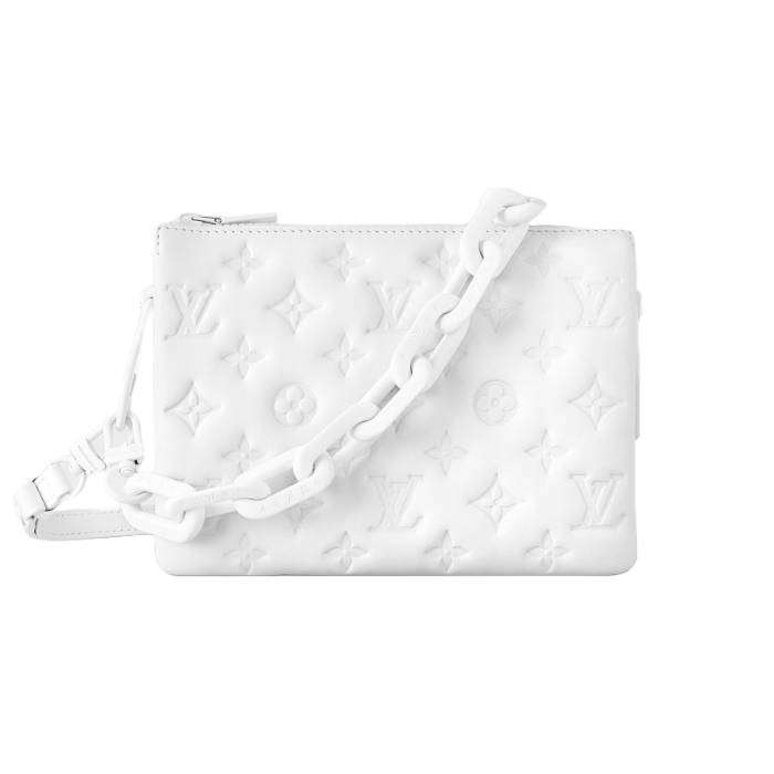 LV 스키 컬렉션에서 새롭게 선보이는 쿠상 BB(Coussin BB). 아프레 스키 특유의 드레스 코드를 고급스러운 감각으로 풀어내 산에 갈 때 휴대하기 좋은 디자인. 이번 시즌의 레디 투 웨어 스타일과 매칭되는 새로운 그라디언트 효과를 입힌 아이템. 하우스의 시그니처 모노그램 패턴을 양각 처리한 양가죽 소재. 이중으로 아연 도금 처리하여 강렬한 분위기를 더하는 청키한 탈착형 체인.