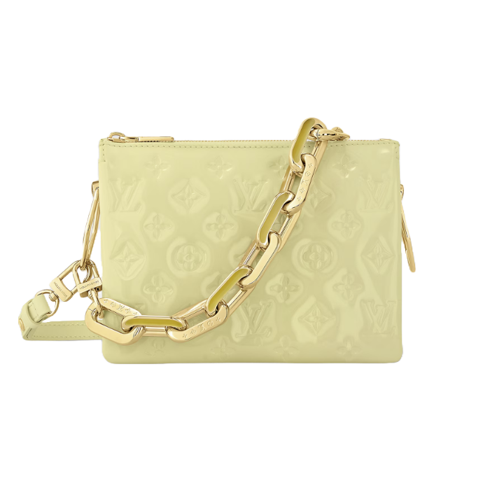 이번 시즌을 맞아 광택이 흐르는 스타일리시한 색조로 새롭게 선보이는 쿠상 BB. 바니시 마감이 돋보이는 푹신한 소재. 양각 처리하여 질감이 느껴지는 모노그램 모티프. 청키한 골드 색상 체인과 넓은 탈착형 텍스타일 스트랩을 활용하여 숄더 백이나 크로스 바디 백으로 연출할 수 있는 아이템. 시크 & 옐로우 색조과 어울리는 톤온톤 레진 인서트를 더한 탈착 가능한 체인.