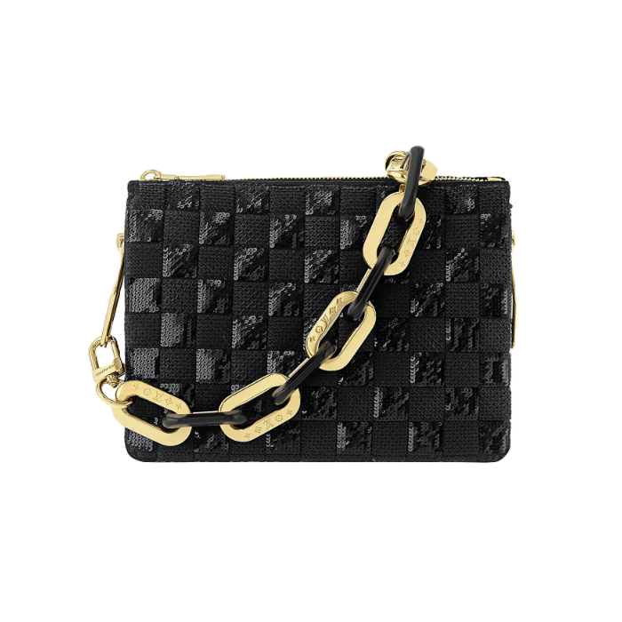 2024 봄-여름 패션쇼에서 선보인 쿠상 BB 핸드백. 블랙 색상의 새틴 소재에 톤 배색의 반짝이는 시퀸으로 메종의 아이코닉한 다미에 패턴을 수놓은 디자인. 조절 가능한 탈착형 가죽 스트랩과 각인 디테일을 더한 블랙 및 골드 색상의 탈착형 체인. 데일리 룩과 이브닝 룩에 모두 어울리며 다양한 방식으로 스타일링할 수 있는 세련된 액세서리.