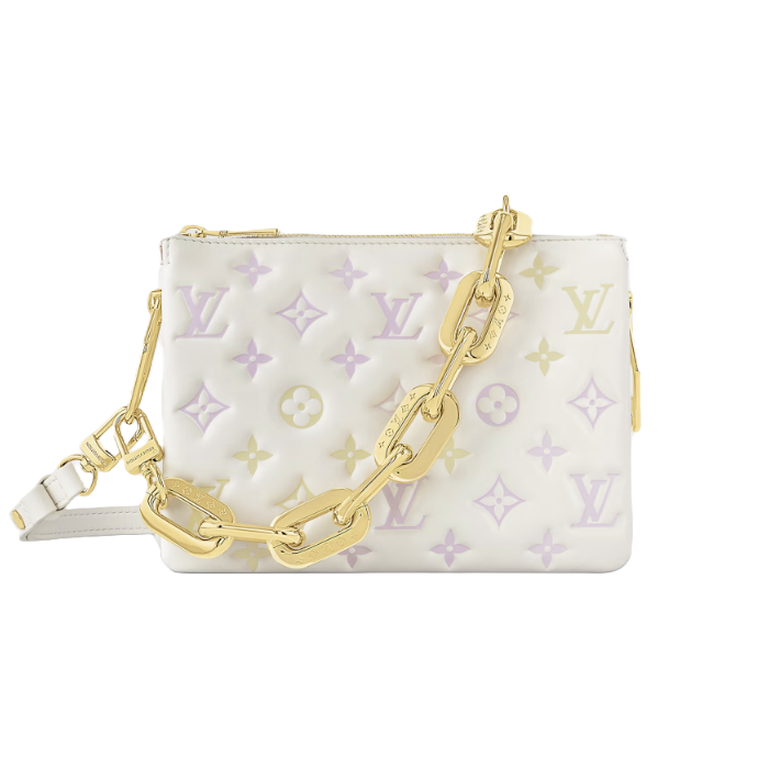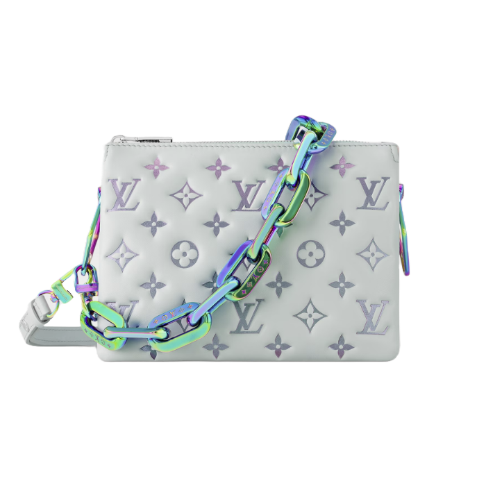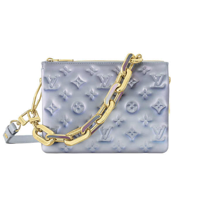 이번 시즌을 맞아 밀키 웨이 캡슐 컬렉션에서 은은한 광택을 자아내는 부드럽고 유연한 램스킨 소재로 선보이는 쿠상 BB 핸드백. 독특한 스프레이 기법으로 구현한 세련된 진주빛 마감이 양각 모노그램 패턴을 한층 돋보이게 하는 디자인. 쿠상 백의 청키한 체인 링크와 레진 소재의 인서트를 번갈아 배치하여 파스텔 색상의 그라디언트 효과를 자아내는 아이템.