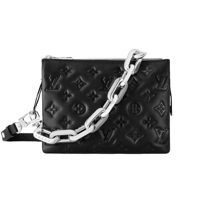 톤 배색 모노그램 패턴을 양각으로 새긴 부드럽고 폭신한 램스킨 소재로 선보이는 쿠상 BB(Coussin BB) 핸드백. 활용도 높으면서도 세련되고 매력적인 미니 버전의 아이템. 블랙 색상의 가죽과 스타일리시한 대비를 이루는 각인된 실버 색상의 링크로 이루어진 청키한 체인. 다양한 방식으로 연출할 수 있는 탈착형 스트랩. 저녁 외출에 꼭 필요한 소지품을 휴대할 수 있는 두 개의 수납공간과 가죽 안감을 구성한 내부.