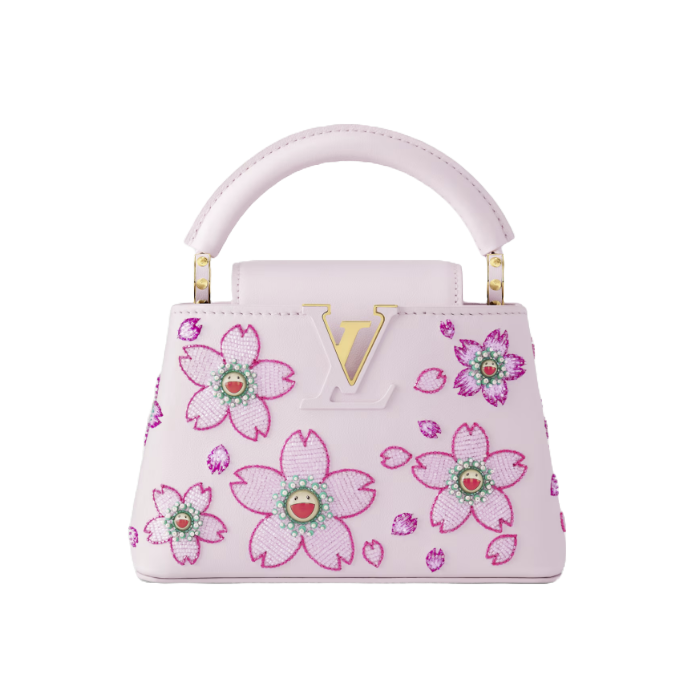 루이 비통 x 무라카미 리에디션 컬렉션의 경쾌한 디자인 코드를 담아 화사하게 재해석해 선보이는 세련된 카퓌신 미니 핸드백. 산뜻한 핑크 색조의 램스킨 가죽 소재. 일본 예술가 무라카미 다카시의 체리 블라썸 모티프를 흩뿌린 듯 배치하고 모티프 각각을 은은하게 빛나는 자수로 수놓아 경쾌하게 연출한 바디 부분. 골드 색상 하드웨어로 감각적인 분위기를 더한 상단 핸들, 스트랩 및 상징적인 LV 시그니처.