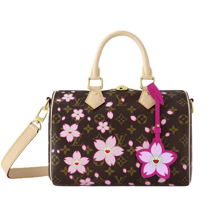 익스클루시브한 루이 비통 x 무라카미 리에디션 컬렉션에서 선보이는 스피디 반둘리에 25. 하우스의 상징적인 모노그램 코팅 캔버스 소재에 저명한 예술가 무라카미 다카시 특유의 경쾌한 스타일이 반영된 화사한 체리 블라썸 모티프를 담아낸 디자인. 탈착형 체리 블라썸 백 참. 포인트가 되어주는 천연 카우하이드 가죽 소재의 우아한 상단 토론 핸들 및 탈착형 가죽 스트랩. 소지품을 안전하게 보관할 수 있는 패드락이 달린 골드 색상의 더블 지퍼형 잠금장치.
