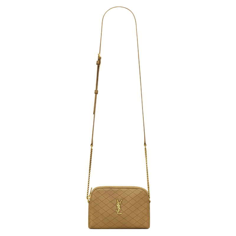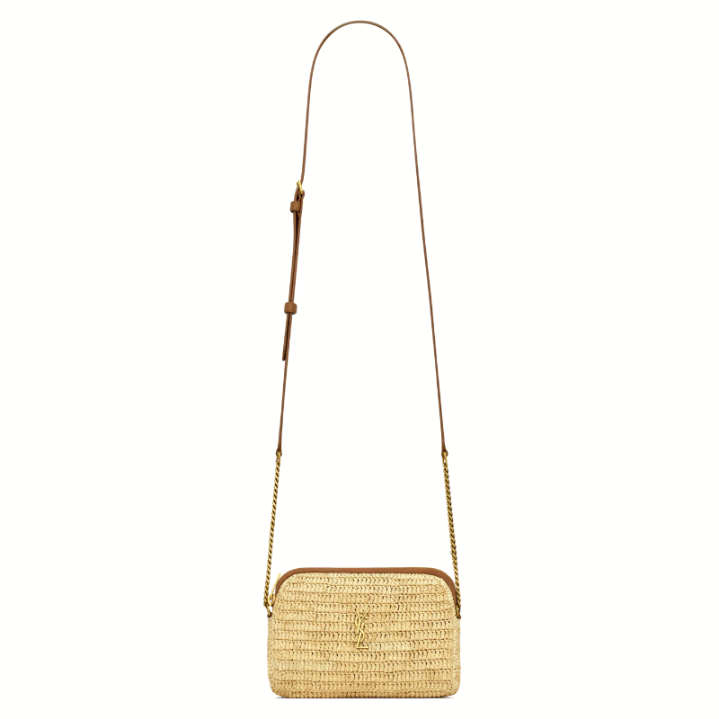 생로랑 라피아 및 베지터블 태닝 가죽 소재의 가비 카메라 지퍼 파우치