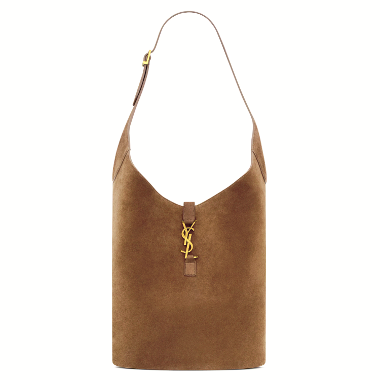 아이코닉한 LE 5 À 7 백의 호보 버킷 백 버전. 스웨이드 소재, 가죽 탭 잠금장치, CASSANDRE 장식.