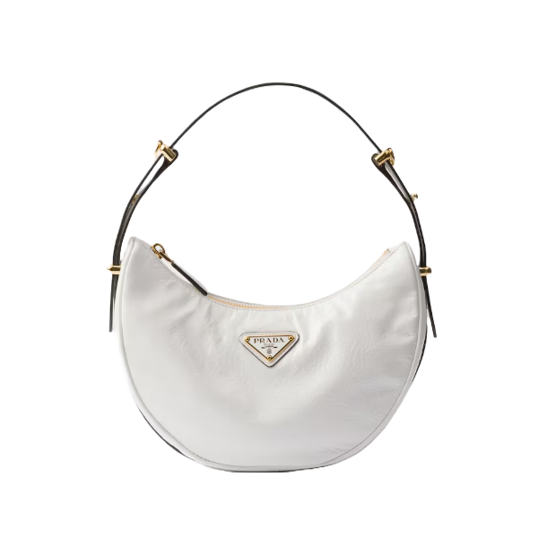 부드러운 촉감의 스웨이드 소재로 호보 디자인에 세련된 매력을 더한 심플한 크레센트 디자인의 프라다 아르케 백입니다. 아이코닉한 트라이앵글 로고로 백이 완성됩니다.